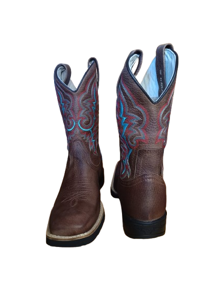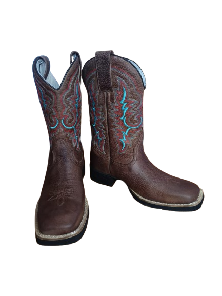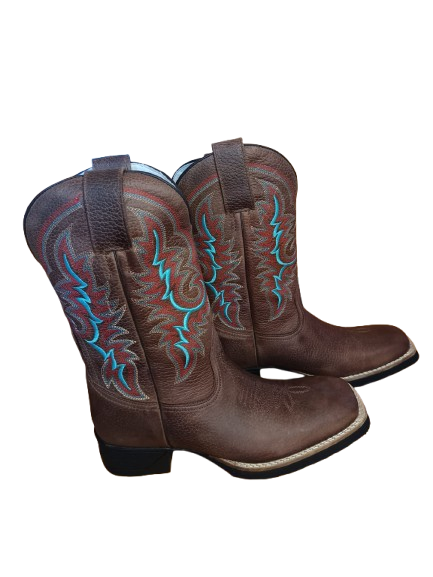 Bota na cor capuccino com bordado no cano em azul e vermelho